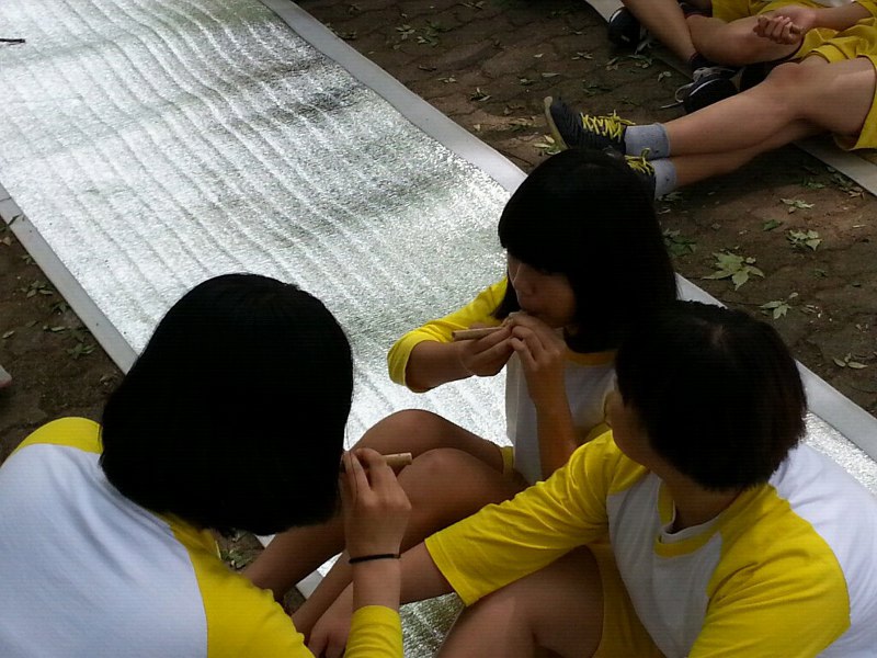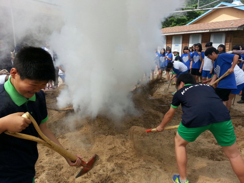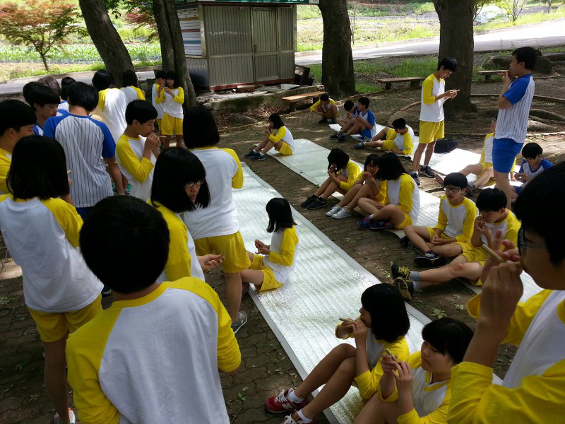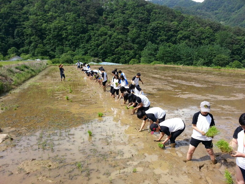 역동적인 삼굿구이 체험의 현장 모내기 체험에 앞서 흑곰샘의 모내기 강의 어찌 소리는 좀 잘 나니? 느티나무 쉼터에선 대나무 피리만들기가 한창입니다.