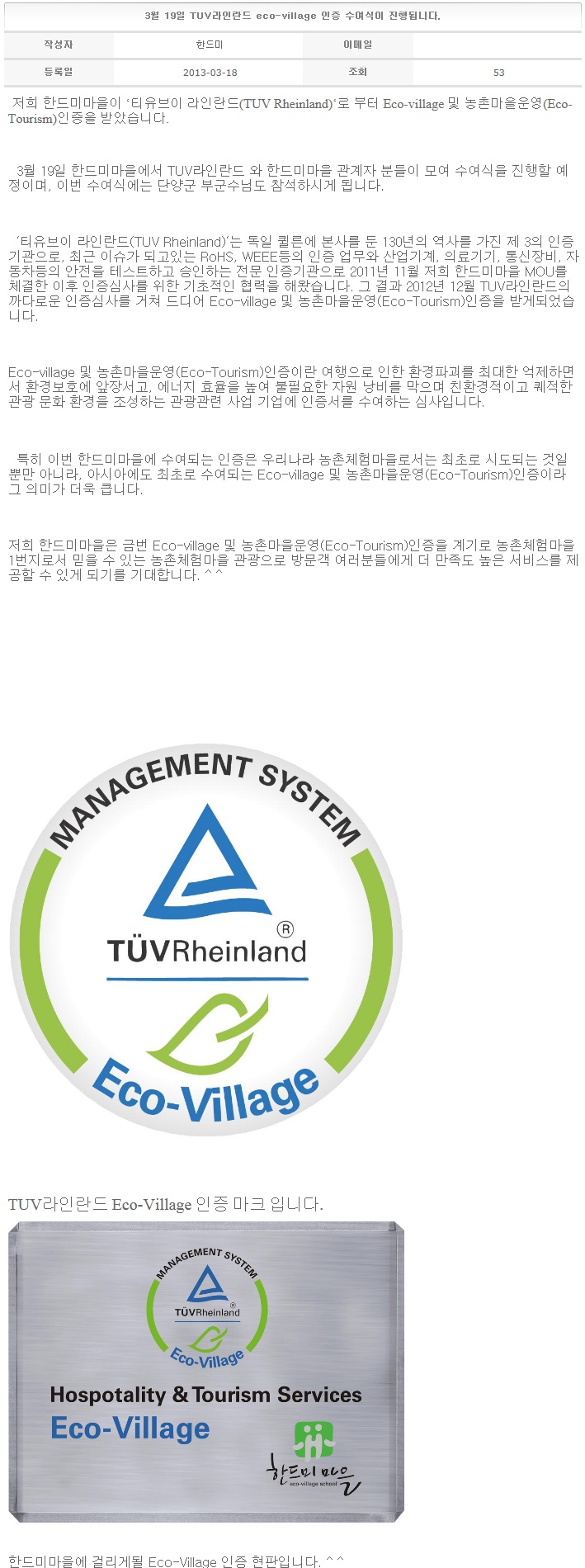 3월 19일 TUV라인란드 eco-village 인증 수여식이 진행됩니다. 2013-03-18