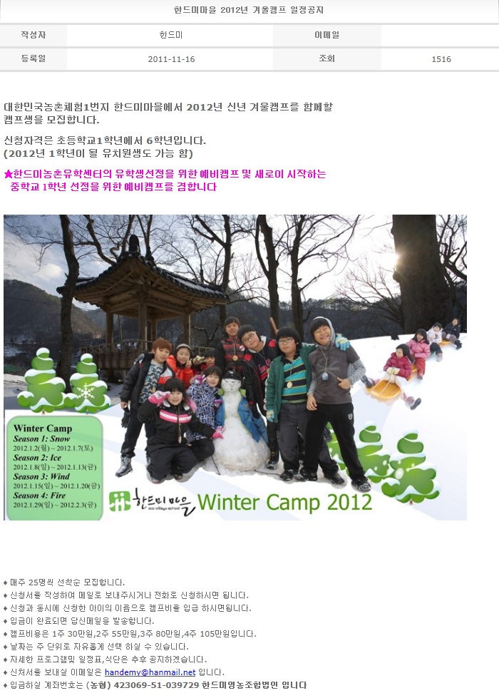 한드미마을 2012년 겨울캠프 일정공지 2011-11-16