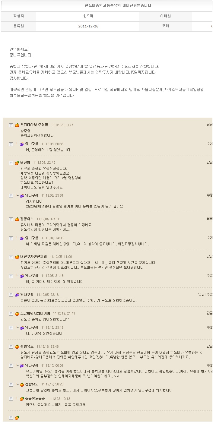 한드미중학교농촌유학 예비신청받습니다 2011-12-26