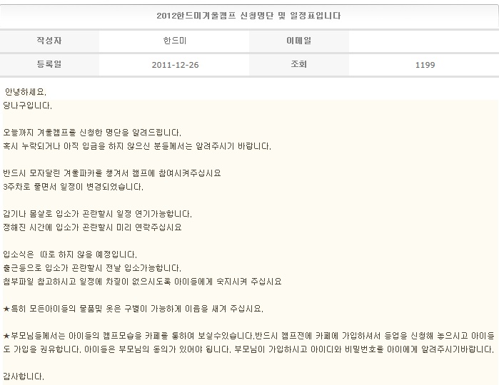2012한드미겨울캠프 신청명단 및 일정표입니다 2011-12-26