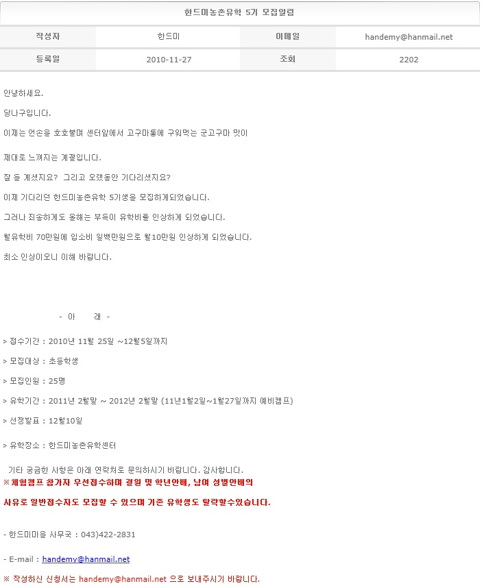 한드미농촌유학 5기 모집알림 2010-11-27