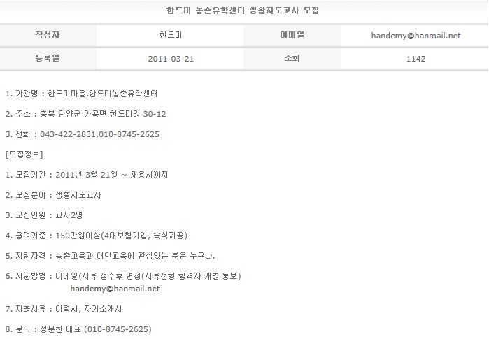 한드미 농촌유학센터 생활지도교사 모집 2011-03-21