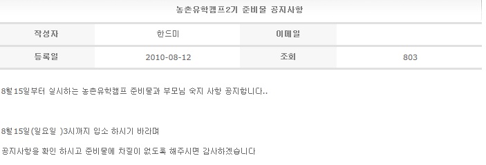 농촌유학캠프2기 준비물 공지사항 2010-08-12