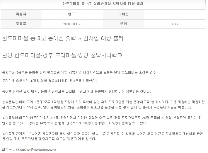 한드미마을 등 3곳 농어촌유학 시범사업 대상 뽑혀 2010-03-23