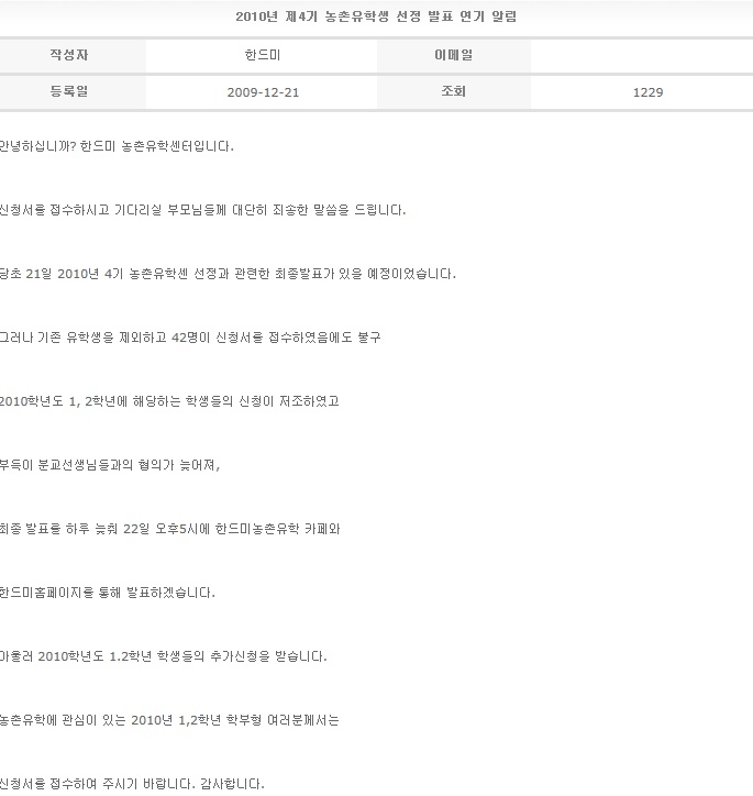 2010년 제4기 농촌유학생 선정 발표 연기 알림 2009-12-21