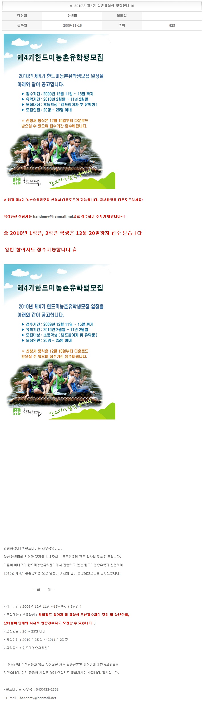 ※ 2010년 제4기 농촌유학생 모집안내 ※ 2009-11-18