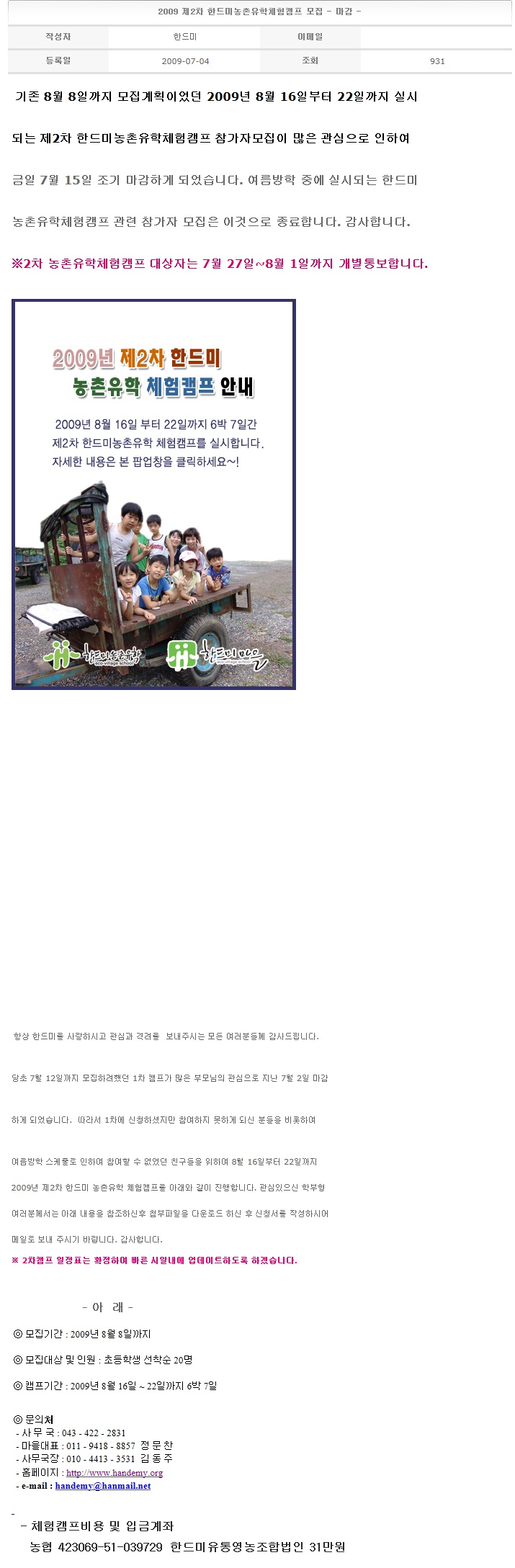 2009 제2차 한드미농촌유학체험캠프 모집 - 마감 - 2009-07-04