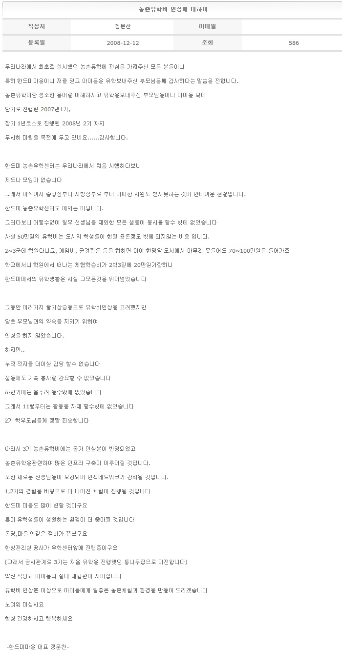 농촌유학비 인상에 대하여 2008-12-12
