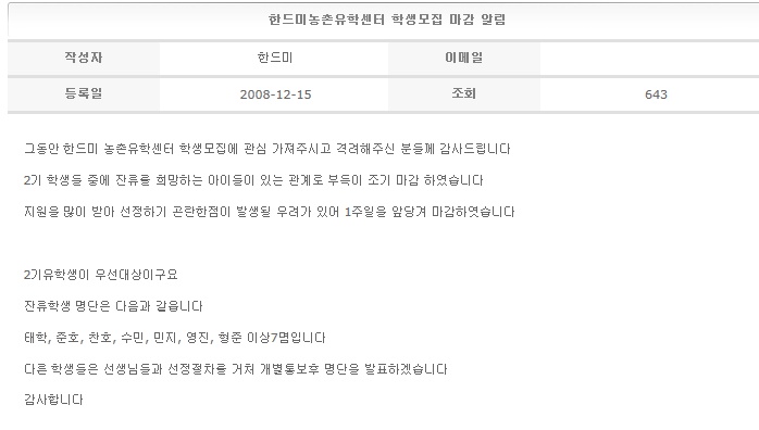 한드미농촌유학센터 학생모집 마감 알림 2008-12-15