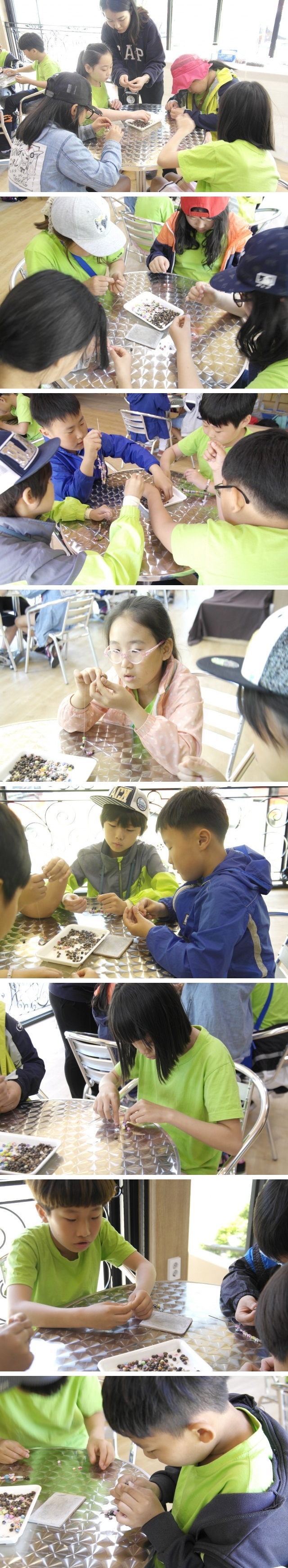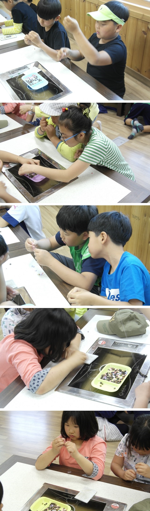 한편, 2층 강당에서는 호박샘과 함께 2,5반 친구들이 율무팔찌를 만들고 있습니다ㅎㅎ 여기도 바늘과 실을 들어보고 여기저기 손도 번쩍번쩍!! 집중해서 예쁜 팔찌를 만들었습니다^^ 집중해서 만들고 있는 충주 남산초등학교 친구들!! 어떤 친구들은 율무팔찌가 아닌... 비즈팔찌를 만들고 있었지만 솔라샘과 호박샘의 설명을 듣고는 바로